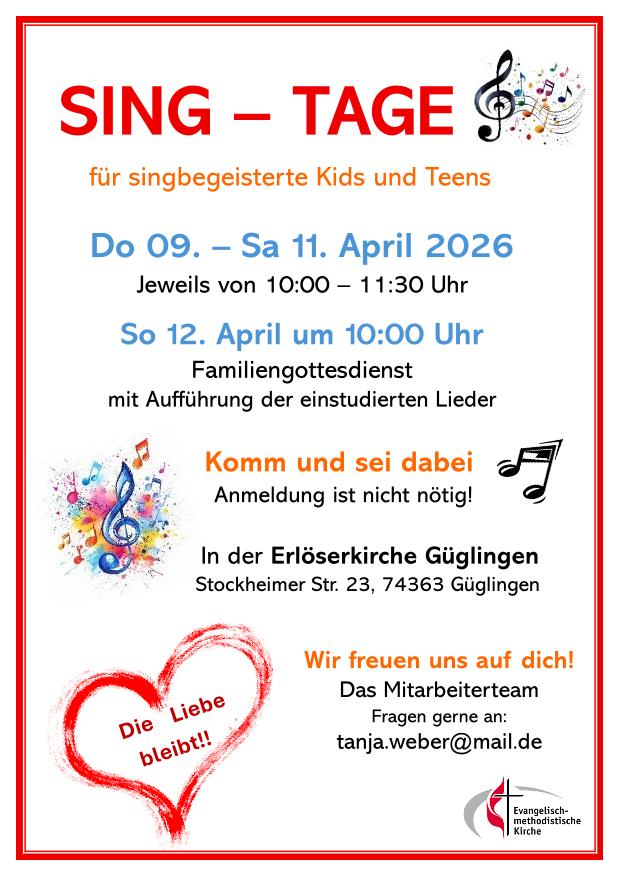 Zum Familiengottesdienst mit Aufführung der einstudierten Lieder am 12.04.26 um 10:00 Uhr ist jeder herzlich eingeladen.